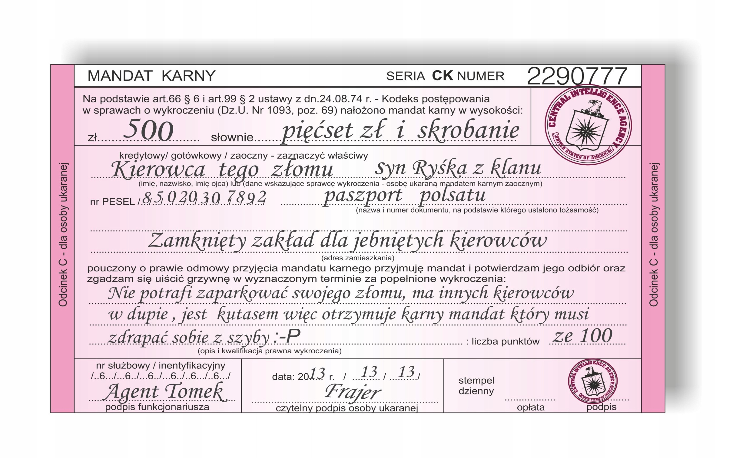 Ukaraj i wystrasz kierowcę który nie potrafi prawidłowo zaparkować. Pozostaw mu pamiątkę za wycieraczką lub na szybie która z daleka imituje prawdziwy mandat.